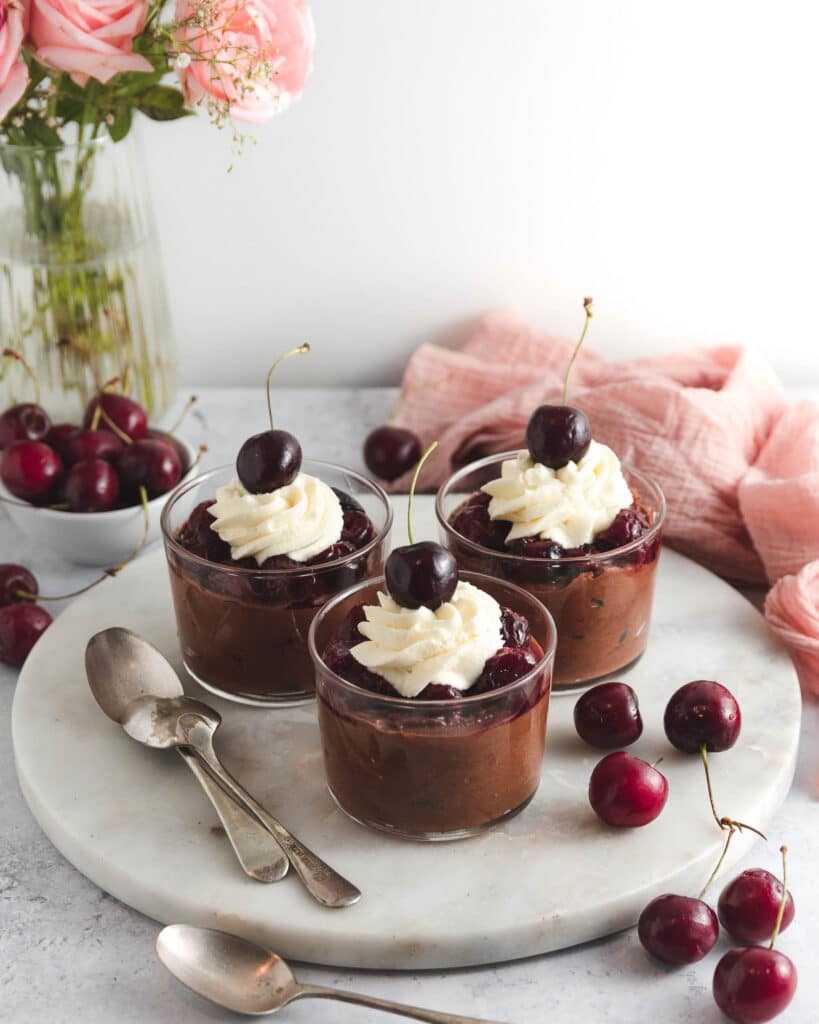 Chocolate mousse is a melt in the mouth dessert when done right. It’s creamy yet light and has a deep rich chocolate flavour. And when topped with sweet cherry compote it’s an absolutely irresistible dessert.